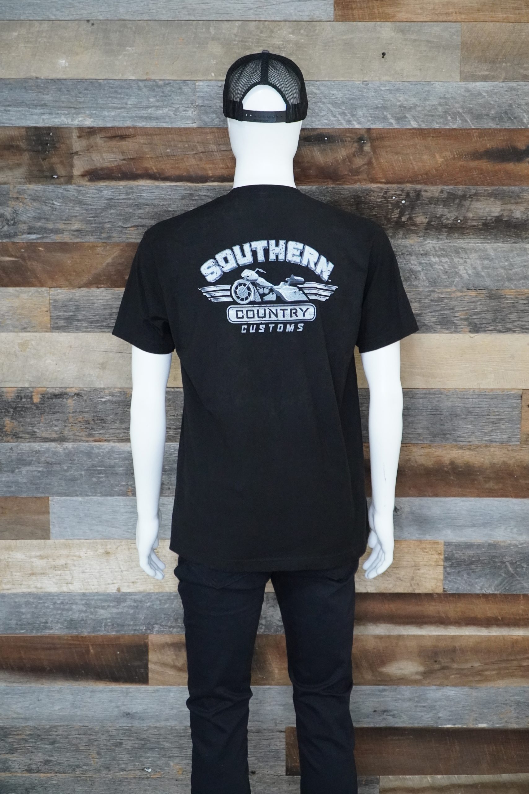 Get your motor running with the same black tee that Steve and the guys wear in the shop! It includes the Southern Country Customs logo on front and back.